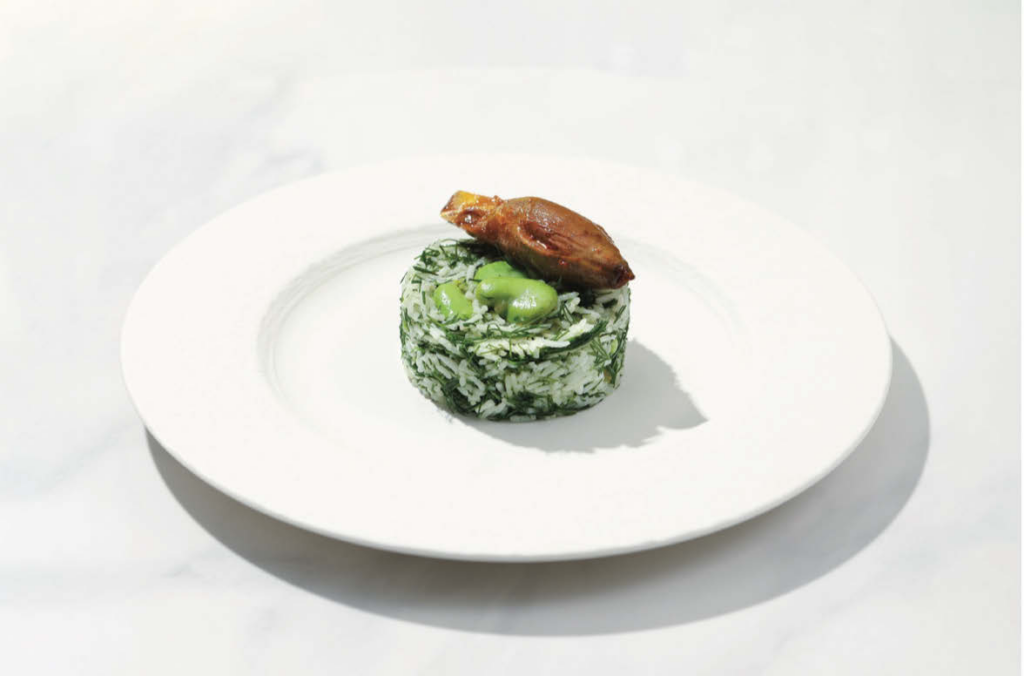 Riz au safran et au yaourt, farci au poulet et aux épines-vinettes.