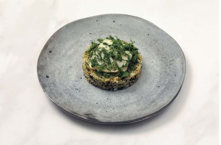 Riz, bar, herbes aromatiques (ciboulette, persil, coriandre, aneth), ail, safran, beurre.