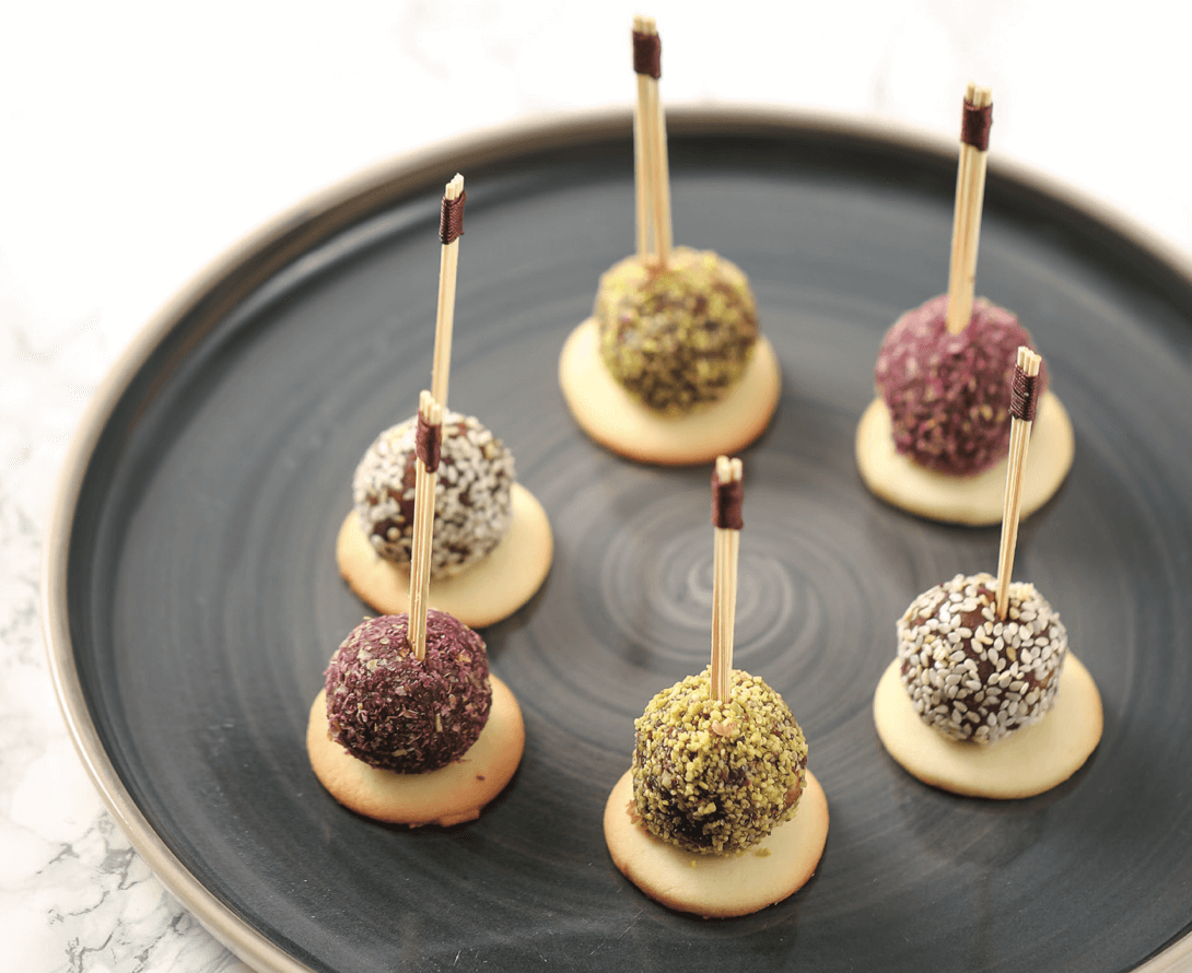 Coffret de 90 pièces, composé de 6 variétés de notre sélection, dont 4 salées et 2 sucrées, idéal pour 15 personnes, 6 pièces par personne.